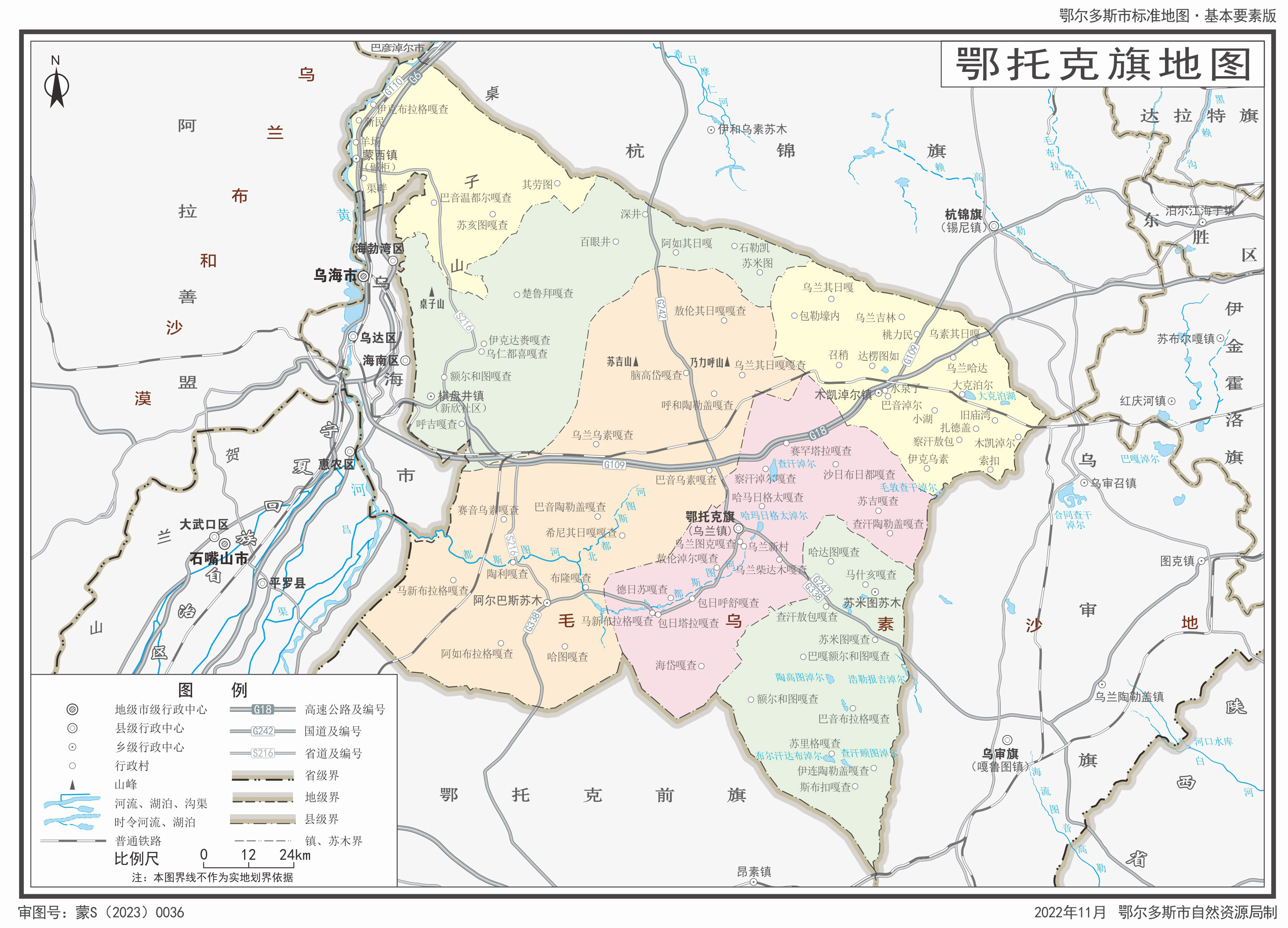 鄂托克旗轄6個(gè)鎮(zhèn)、2個(gè)鄉(xiāng)、4個(gè)蘇木: