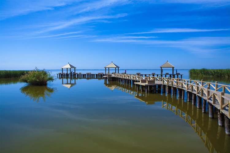 哈素海水質肥沃,湖內(nèi)蘆葦叢生、鳥飛魚躍。岸邊涼亭水榭柳綠成蔭,碧水青山相映成輝,有"塞外西湖"之稱。置身哈素海,極目遠眺,只見晴空碧水,蔚藍一色,蒲萍叢叢,你會覺得哈素海宛如已一副淡雅的水墨畫。如果你停舟湖中,看對對歐鳥翻飛底空,群群野鴨出沒葦叢,聽遠處高亢聊亮的漁歌,近旁魚躍出水波剌剌的 聲響,你會感覺到哈素海像一首詩。