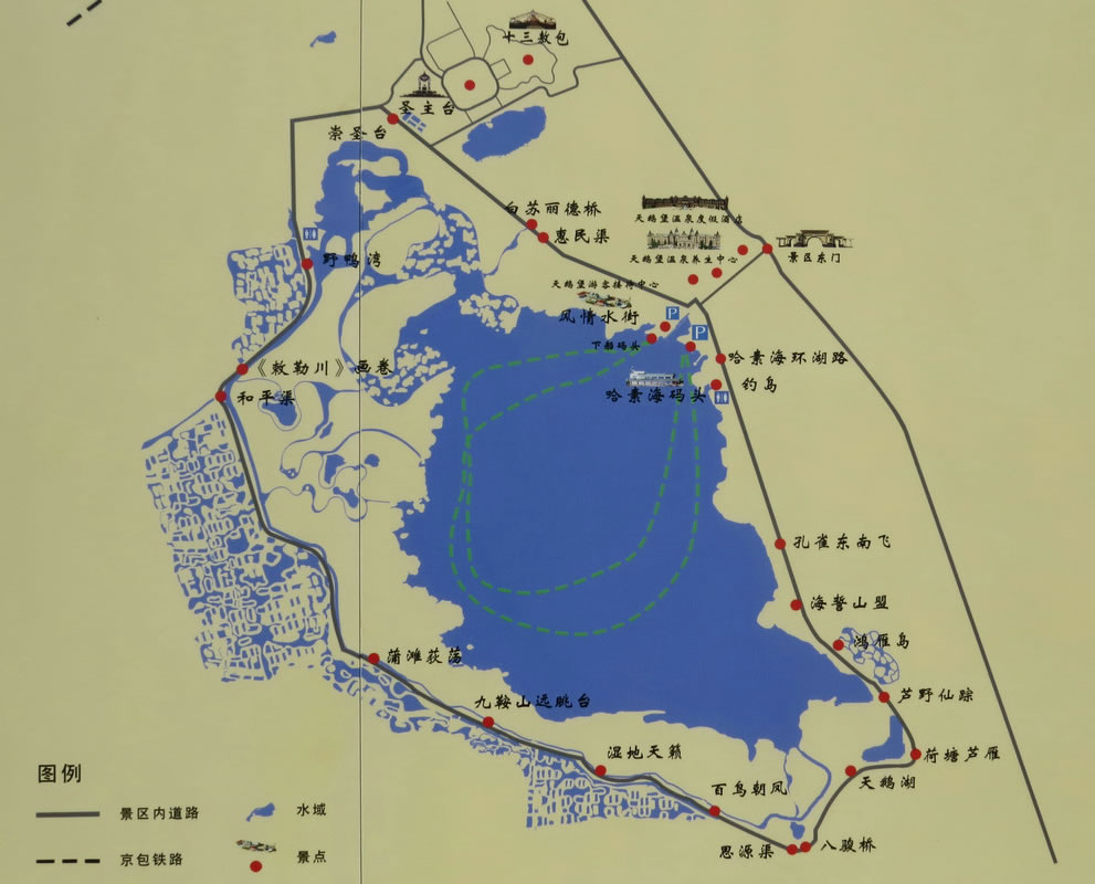 湖內(nèi)有一座水庫和一個漁場,設置游船供游客飽覽湖光山色,并可在船上品嘗鮮魚。哈素海度假村依湖而建,設有多種旅游項目和服務設施。