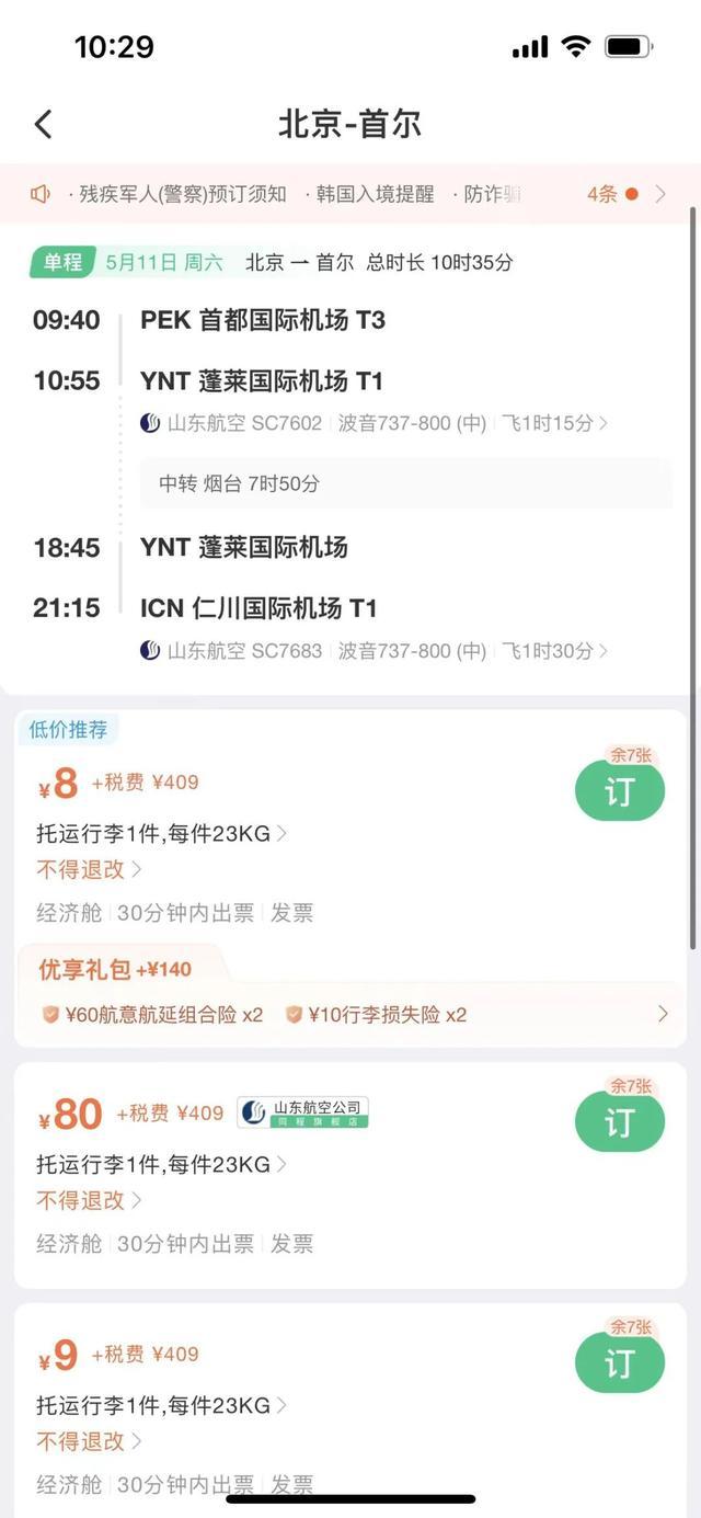 國(guó)際機(jī)票方面,中新經(jīng)緯查詢發(fā)現(xiàn),5月11日北京飛往首爾的機(jī)票(不含稅)價(jià)格低至8元,但另需409元稅費(fèi)。具體來(lái)看,該航班5月11日早9點(diǎn)40分從北京首都機(jī)場(chǎng)起飛,經(jīng)煙臺(tái)蓬萊國(guó)際機(jī)場(chǎng)轉(zhuǎn)機(jī),于當(dāng)天晚上9點(diǎn)15分落地仁川國(guó)際機(jī)場(chǎng)。