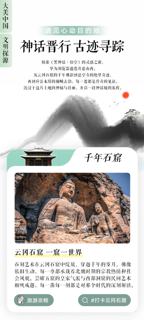 華為瀏覽器的“遇見(jiàn)心動(dòng)目的地”專題還將于9月29日上線大美中國(guó)、文明探源、神話晉行專題,包括大同懸空寺、朔州崇福寺、應(yīng)縣木塔、臨汾鐵佛寺等《黑神話:悟空》游戲中的取景地都會(huì)有相應(yīng)的旅游攻略。專題還會(huì)根據(jù)旅游的目的地和路線的不同,提供多種不同的行程方案,可以根據(jù)自身的實(shí)際情況進(jìn)行挑選,讓我們的旅程變得無(wú)比充實(shí)!