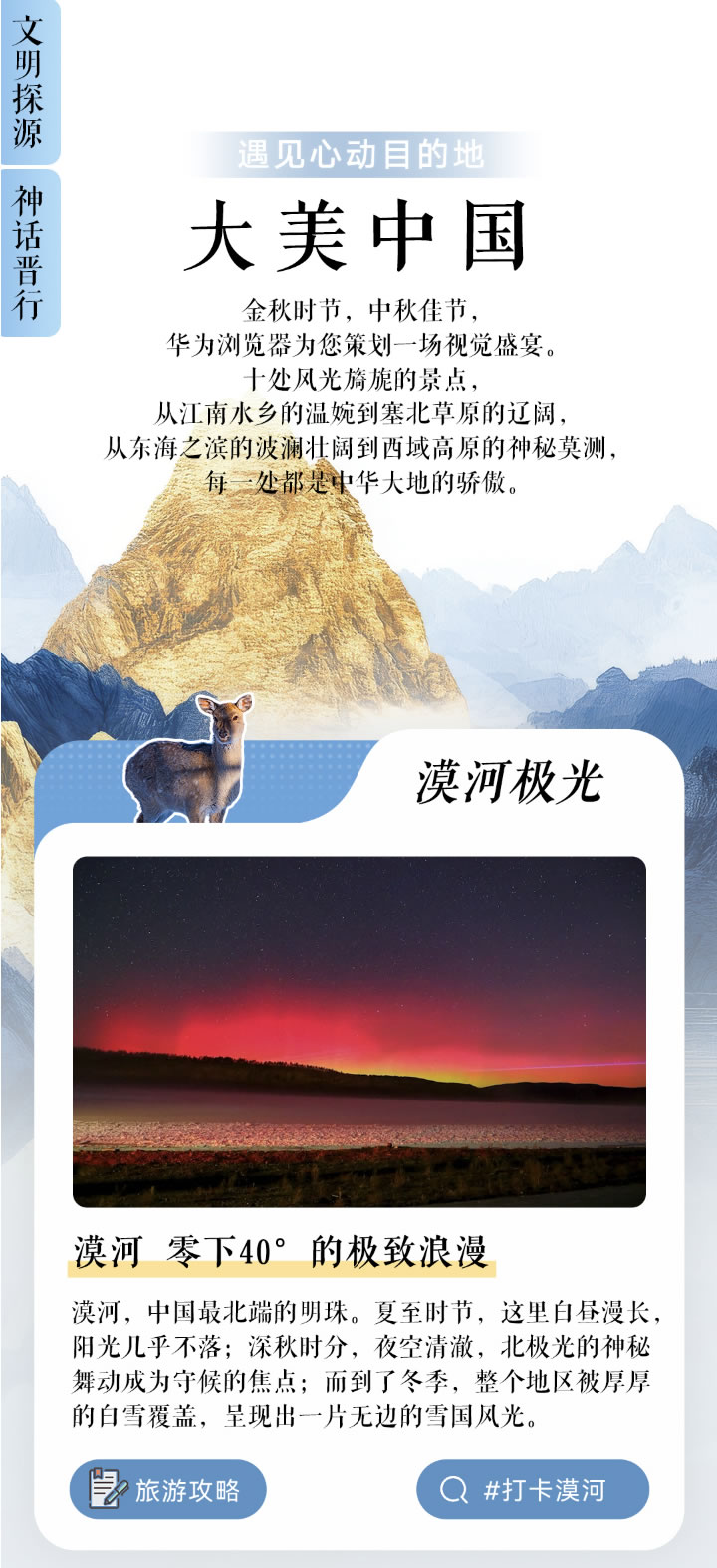 “大美中國”可以說給熱愛自然風(fēng)光的愛好者帶來了視覺盛宴。里面精選了十處極具代表性的中華美景,從溫婉細(xì)膩的江南水鄉(xiāng)到遼闊壯麗的塞北草原,從波瀾壯闊的東海之濱到神秘莫測(cè)的西域高原,每一處都是對(duì)中華大地絕美風(fēng)光的極致詮釋。其中,以漠河“零下40°的極致浪漫”為例,無論是夏日的長晝、深秋的北極光,還是冬日的雪國風(fēng)光,都讓人心生向往。用戶不僅可以在專題頁中詳細(xì)了解每一處景點(diǎn)的獨(dú)特魅力,還能一鍵直達(dá)詳細(xì)旅游攻略,包括大興安嶺自駕環(huán)線等周邊推薦,輕松規(guī)劃出完美的國慶出游計(jì)劃。