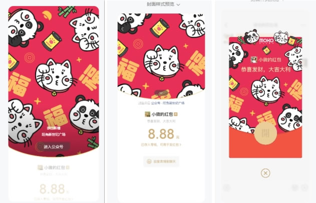 當(dāng)下微信發(fā)紅包搶紅包已成特有的新春社交儀式,據(jù)微信官方數(shù)據(jù)顯示,2024年除夕夜微信用戶共搶到微信紅包50.8億個(gè),發(fā)送拜年紅包1.9 億次,各大品牌也紛紛推出微信紅包封面,為用戶的拜年社交增添喜氣。蛇年新春,MOKO與插畫家 Cheeky Cheeky 厚面子合作,延續(xù)萌爆漫畫風(fēng),由厚面子 Cosplay 新年吉祥物招財(cái)貓和頂流大熊貓,在紅包封面上盡顯魅力。新年前分階段陸續(xù)發(fā)放1.5萬個(gè)微信紅包封面,為今年的拜年增添滿滿萌趣,拆開紅包的親友,不僅能解鎖MOKO超值新春旅客專屬福利,還能再次回味此前深受用戶喜愛的國風(fēng)熊貓視頻。