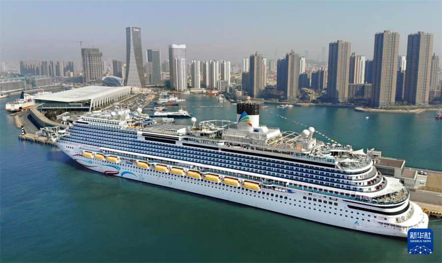 “愛達(dá)·魔都號(hào)”郵輪靠泊在青島郵輪母港碼頭(4月6日攝,無人機(jī)照片)。