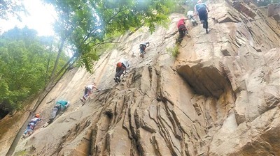 在戶外探險教練雨果的指導(dǎo)下,北青報記者戴上頭盔、穿好安全裝備——一種從大腿根部套起、勒緊腰部的“安全褲”,腰間連著兩條繩索,各掛著一個鐵扣,稱為腕鎖。出發(fā)前,教練反復(fù)叮囑:腕鎖要一前一后掛在沿山體布設(shè)的“生命線”上,不能同時解開。