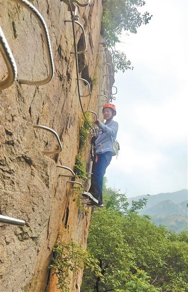 崔女士熱愛徒步,這次是跟隨徒步群一起參加飛拉達(dá)體驗活動。她記得,剛剛站上幾米高的巖壁回頭望下去時,心里還是“咯噔”了一下,有些發(fā)怵。“剛開始要調(diào)兩個鐵扣時我有些慌,越慌越怕,后來操作熟了,發(fā)現(xiàn)始終有一個扣子在鋼絲上,安全感一下子就上來了。”