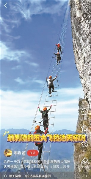 玩法也不只一種。飛拉達(dá)還衍生出不少“進(jìn)階版”,比如洞穴飛拉達(dá)、城市飛拉達(dá)——在重慶,有全國首個城市飛拉達(dá)項目,參與者要沿著鐵梯一路爬到幾十層樓頂,站在城市上空看風(fēng)景;千靈山的洞穴飛拉達(dá)則把滑索、天梯、速降全都安排上了,在潮濕悶熱的洞穴里來一場冒險,吸引了不少愛挑戰(zhàn)的年輕人。