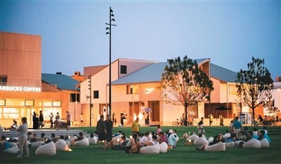 游客在秦皇島阿那亞社區(qū)內(nèi)的街區(qū)廣場(chǎng)上休閑。