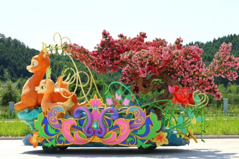 “鹿逐花夢(mèng)花車”,巧妙融合了小興安嶺獨(dú)特的自然景觀與生物多樣性。車頭三只靈動(dòng)的小鹿象征著伊春“中國(guó)鹿鄉(xiāng)”的美譽(yù),與九峰山、金山鹿苑等標(biāo)志性景觀交相輝映。盛開的杜鵑、百合和冰凌花點(diǎn)綴其間,展現(xiàn)伊春四季分明的生態(tài)特色。花車通過森林古樹與野生動(dòng)物的和諧共生場(chǎng)景,生動(dòng)詮釋了伊春“生態(tài)立市”的發(fā)展理念,既彰顯了“中國(guó)林都”豐富的自然資源,又傳遞出人與自然和諧共處的生態(tài)文明思想,讓觀眾在夢(mèng)幻的森林之旅中感受生態(tài)保護(hù)的深遠(yuǎn)意義。