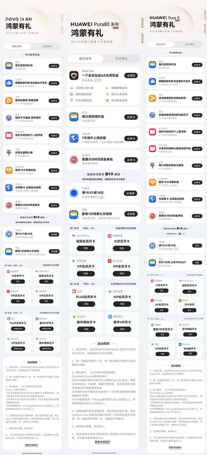 暑期,華為“負(fù)一屏”還上線了“鴻蒙有禮”權(quán)益禮包,覆蓋影視娛樂、旅行交通、外賣餐飲等多重場景,為用戶帶來更便捷、更優(yōu)惠、更智慧的暑期生活服務(wù)。購買Pura X、nova 14系列及Pura 80的新用戶還有額外的“新機專享”禮包。喚醒小藝說:“幫我領(lǐng)鴻蒙有禮”也能跳轉(zhuǎn)領(lǐng)取。