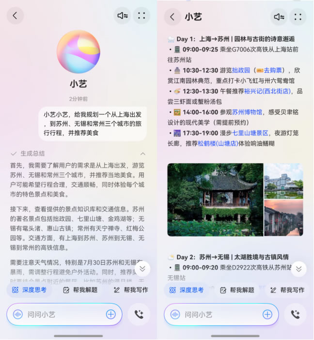 對(duì)于多城聯(lián)游來(lái)說(shuō),行程規(guī)劃十分復(fù)雜。在鴻蒙5的加持下,擁有全新大腦的對(duì)話思考式小藝變得“更聰明”,能理解用戶需求并給出針對(duì)性的回答。用戶只需對(duì)小藝說(shuō)出需求,例如:“小藝小藝,給我規(guī)劃一個(gè)蘇錫常園林和美食主題三日游。”小藝便能迅速生成一份詳盡的圖文攻略,將蘇州的古典園林、無(wú)錫的太湖風(fēng)光,以及常州獨(dú)具特色的中華恐龍園都囊括其中,給出路線、交通、美食等建議。旅途中遇到感興趣的建筑或是不認(rèn)識(shí)的植物,也可以隨時(shí)拍照后拖給小藝或圈選屏幕問問小藝,即時(shí)獲得百科解答,讓旅途充滿探索的樂趣。