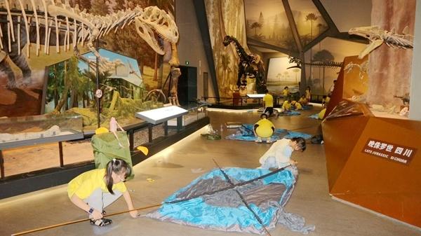 為應(yīng)對(duì)夜場(chǎng)活動(dòng)數(shù)量多、而館內(nèi)工作人員有限的情況,博物館引入專業(yè)研學(xué)團(tuán)隊(duì)負(fù)責(zé)夜宿活動(dòng)的策劃與執(zhí)行。30組親子家庭在破冰活動(dòng)后,跟隨專業(yè)講解員走進(jìn)展廳,深入了解脊椎動(dòng)物的演化歷程;體驗(yàn)4D電影和化石盲盒等手工制作;最后,在博物館鎮(zhèn)館之寶——長達(dá)26米的馬門溪龍骨架化石下搭起帳篷,伴著生動(dòng)的睡前故事進(jìn)入夢(mèng)鄉(xiāng)。