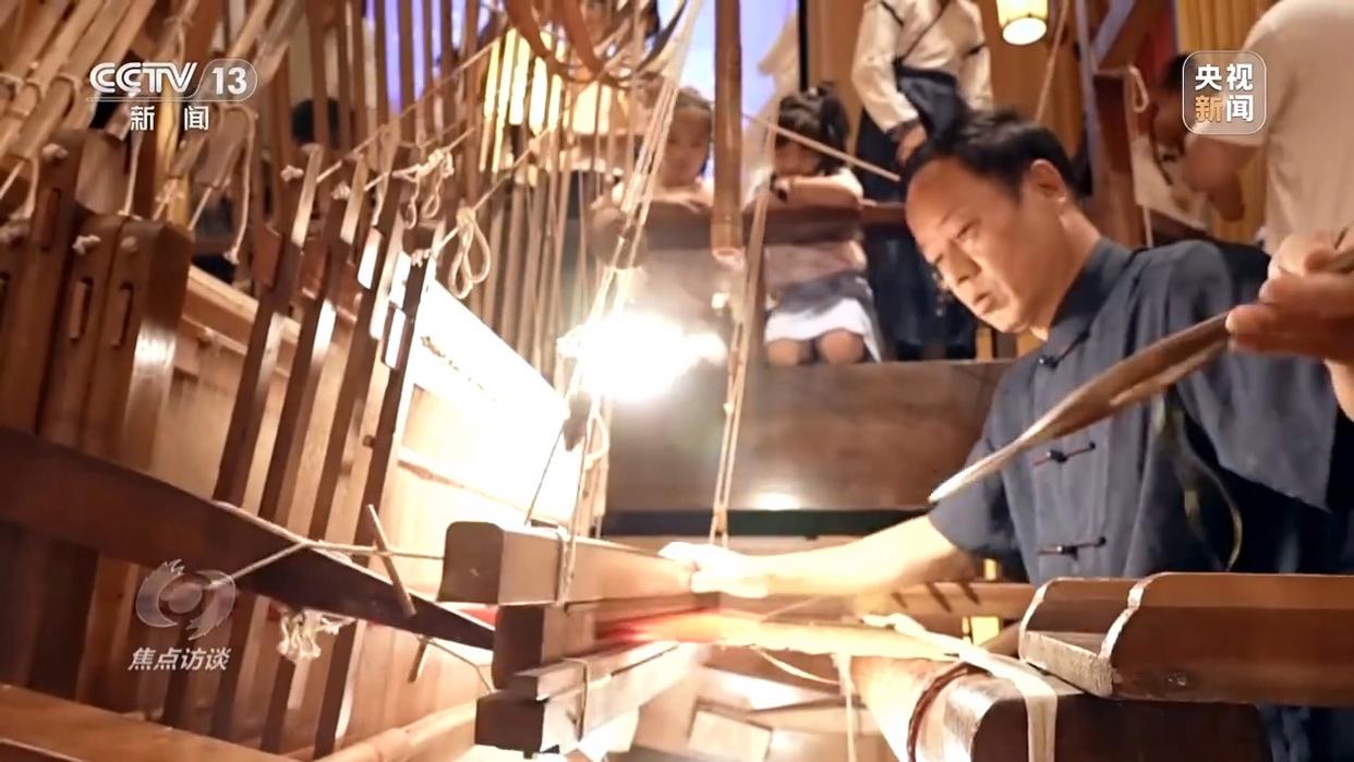 整個(gè)博物館最為壯觀的莫過于核心位置的大型蜀錦織造工場,蜀錦非遺省級傳承人曹代武正帶領(lǐng)團(tuán)隊(duì),在一臺(tái)清代道光年間的小花樓木織機(jī)前,為游客們演繹著古老的織造技藝。這臺(tái)織機(jī)長6米、高5米、寬1.5米,龐大的木質(zhì)“機(jī)甲”與機(jī)器上細(xì)如發(fā)絲的絲線形成強(qiáng)烈反差。兩位織機(jī)師傅默契配合、共同操作,方能織就那一幅幅絢麗奪目的蜀錦。