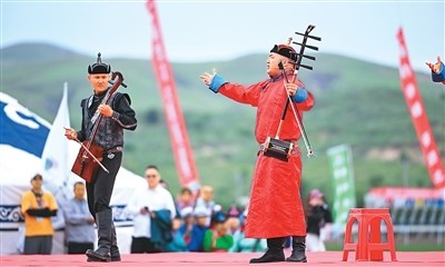 演員在內(nèi)蒙古自治區(qū)第十一屆少數(shù)民族傳統(tǒng)體育運動會(巴林右旗分賽場)開賽儀式上表演。