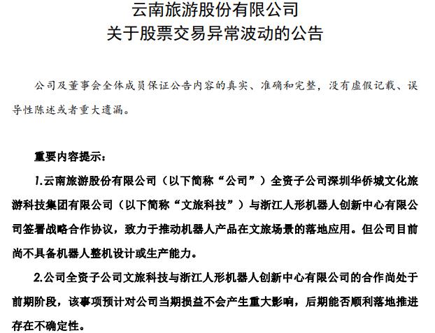 根據(jù)云南旅游22日盤后發(fā)布的異動公告,目前,雙方合作尚處于前期階段,該事項預計對公司當期損益不會產生重大影響,后期能否順利落地推進存在不確定性。另外,公司目前尚不具備機器人整機設計或生產能力。
