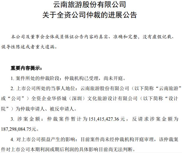 根據(jù)公司7月26日發(fā)布的公告,公司全資企業(yè)設計院就永州湘源文化旅游有限公司(以下簡稱“永州湘源”)未按照合同約定支付款項事宜向中國國際經濟貿易仲裁委員會提起仲裁,仲裁案件金額暫計為1.51億元,該仲裁立案已獲受理,尚未開庭審理。設計院于近日收到通知,中國國際經濟貿易仲裁委員會決定受理永州湘源提出的反請求申請,對方請求退回1億元啟動資金及支付占用費2304.67萬元等多項費用,涉及金額合計1.87億元。目前案件尚未經仲裁機構開庭審理。
