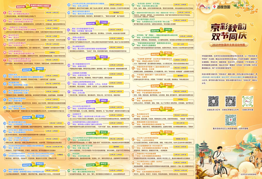 為豐富假期生活,北京市文化和旅游局聯(lián)合百度地圖推出“中秋國慶文旅活動(dòng)地圖”,集中呈現(xiàn)全市50余項(xiàng)特色文旅活動(dòng),涵蓋自然風(fēng)光、文化體驗(yàn)、親子娛樂、紅色教育等多個(gè)主題,助力公眾輕松規(guī)劃假日行程,盡享京秋韻味。