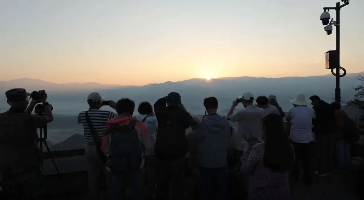 夜色未褪,寒意襲人,攝影師們背著專業(yè)設(shè)備,沿著登山步道向山頂進(jìn)發(fā)。當(dāng)?shù)谝豢|晨光穿透云層灑落在連綿的丹霞峰叢時(shí),赭紅色的山體仿佛披上了金色霞衣,在朝陽的映照下熠熠生輝。陡峭巖壁與平緩山脊勾勒出極具張力的線條,丹霞地貌雄渾壯闊的肌理盡顯無遺?扉T聲此起彼伏,攝影師們或俯身調(diào)整參數(shù),或借助三腳架耐心捕捉光影變化,專注記錄每一個(gè)精彩瞬間。