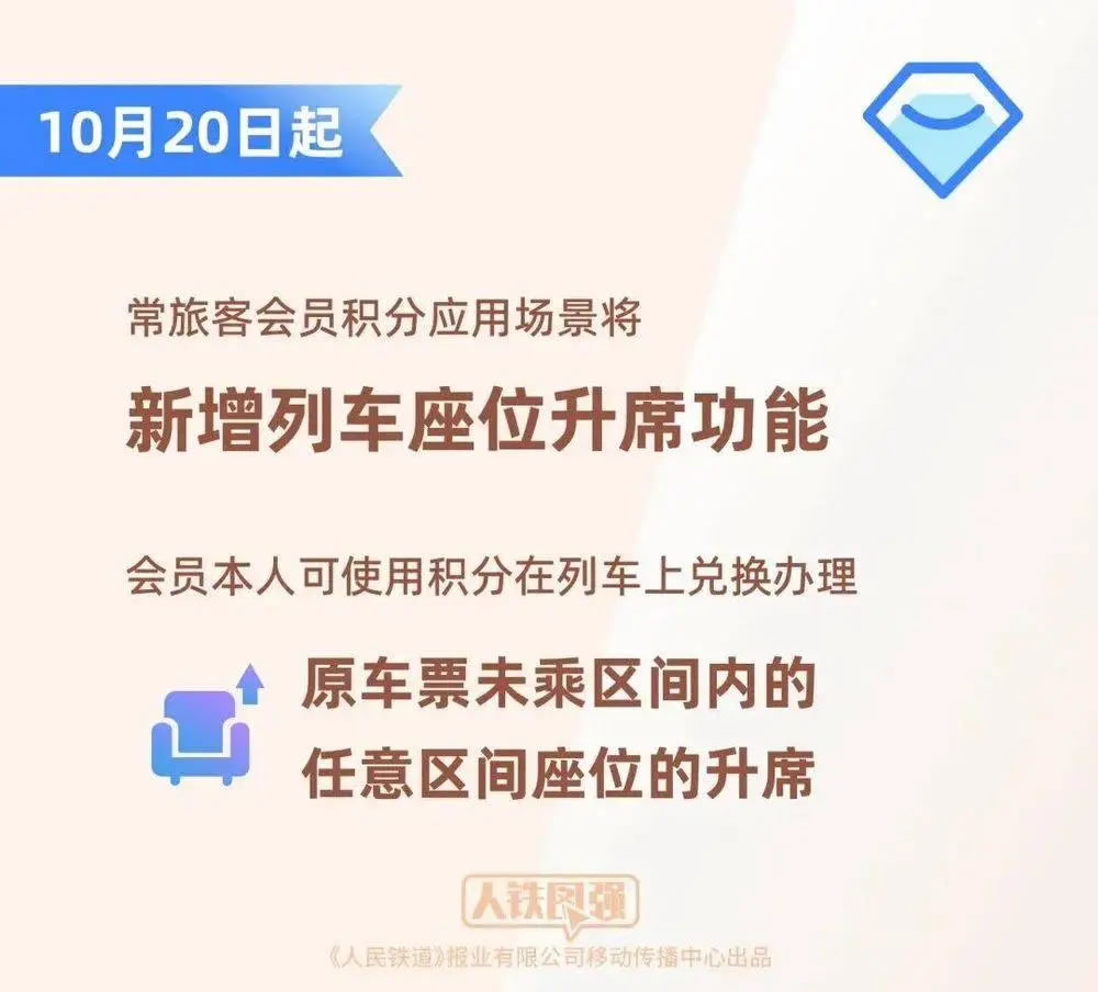10月20日起,常旅客會員積分應(yīng)用場景將新增列車座位升席功能,會員本人可使用積分在列車上兌換辦理原車票未乘區(qū)間內(nèi)的任意區(qū)間座位的升席。乘車途中,會員可掃描座椅扶手上的“鐵路暢行”二維碼登記升席需求,也可直接聯(lián)系列車工作人員辦理;接到旅客升席需求后,列車工作人員將根據(jù)列車座席空余情況及時(shí)進(jìn)行辦理。