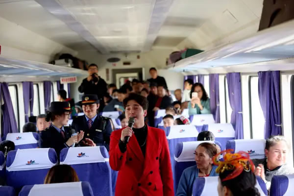 火車(chē)上,《和田是個(gè)好地方》《新疆姑娘》《祝福祖國(guó)亞克西》等經(jīng)典文藝節(jié)目輪番上演,悠揚(yáng)的旋律和深情的演唱打動(dòng)著在場(chǎng)的每一位旅客,讓車(chē)廂成為流動(dòng)的舞臺(tái)。文藝表演結(jié)束后,文旅資源宣傳推介環(huán)節(jié)緊隨其后,工作人員通過(guò)生動(dòng)講解與展示,帶領(lǐng)旅客提前領(lǐng)略和田的獨(dú)特風(fēng)光與人文魅力。此外,宣講人員還用接地氣的家常話(huà)、互動(dòng)感十足的小問(wèn)答,把理論知識(shí)講得鮮活有趣,讓旅客們?cè)诼猛镜乃槠瑫r(shí)光里,既能放松休憩,又能輕松收獲思想啟迪,讓出行多了一份別樣的“精神補(bǔ)給”。