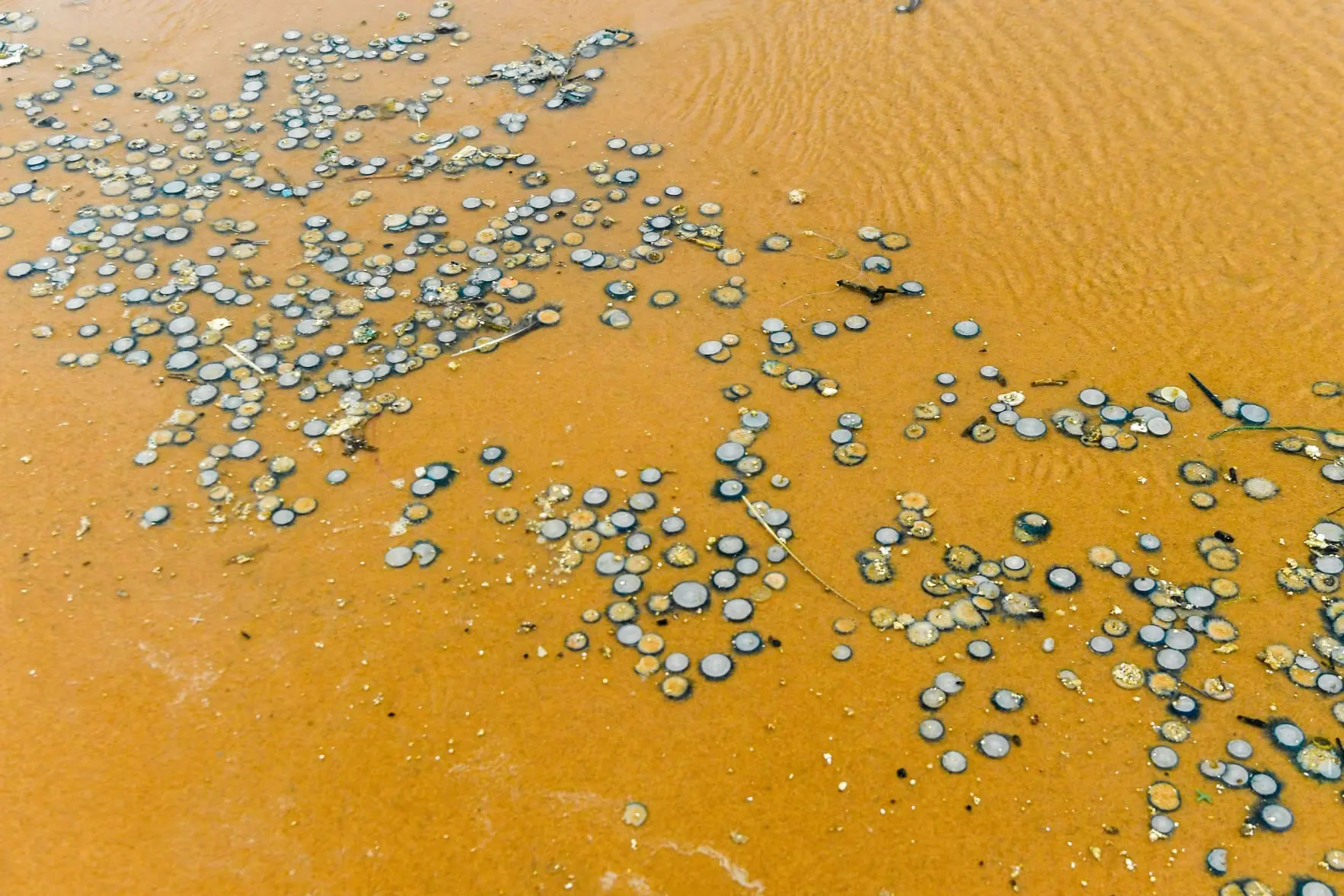 央廣網(wǎng)?10月23日消息(記者林韋瑋 付美斌 實習(xí)記者郭心怡)近日,?谑形骱0冻霈F(xiàn)大量形似“硬幣”的生物,這些生物“緊密鑲嵌”在沙灘上,遠遠望去,宛如無數(shù)枚銀色硬幣鋪灑在海岸線上。經(jīng)專家證實,該生物為銀幣水母,具有一定弱毒性,接觸人體可能引發(fā)灼痛、紅斑或皮疹,游客在海邊游玩時應(yīng)避免主動觸碰。