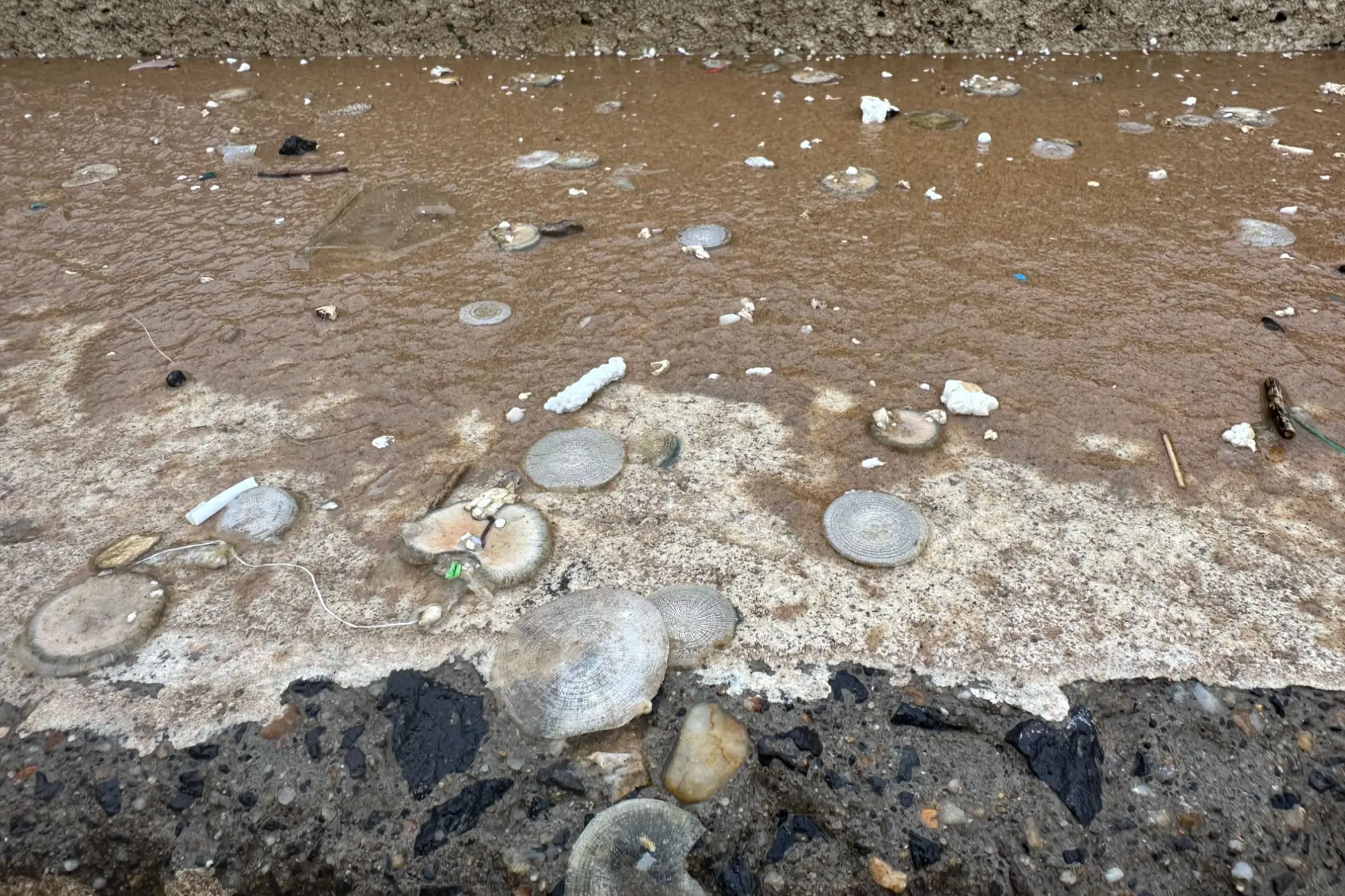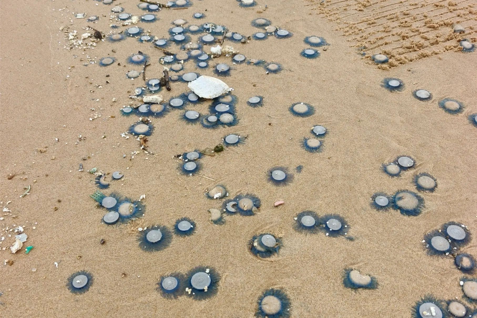 海灘上出現(xiàn)的銀幣水母(央廣網(wǎng)發(fā) 康登淋 攝)