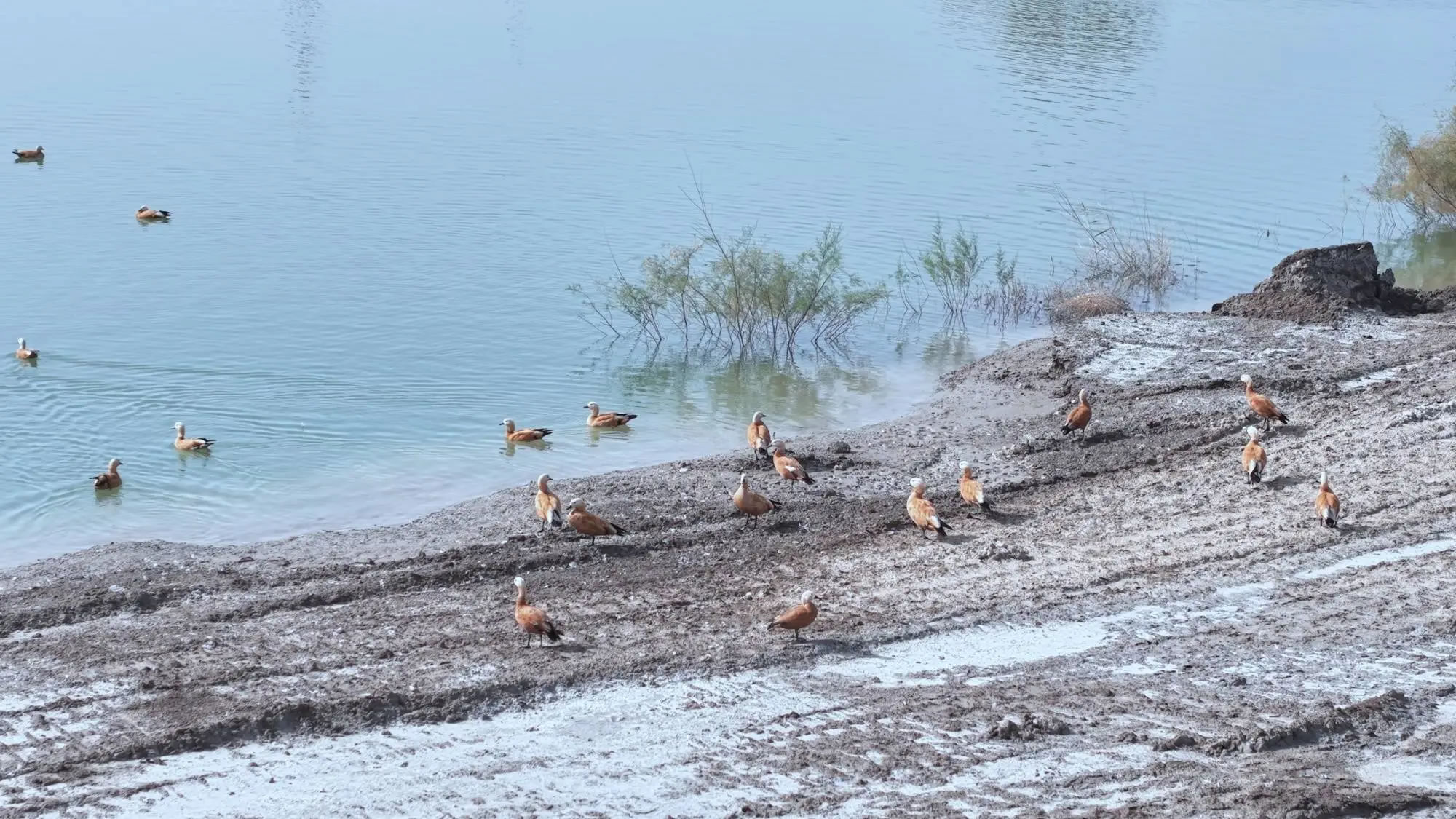 深秋時(shí)節(jié),新疆輪臺(tái)縣草湖鄉(xiāng)可可橋村迎來(lái)大批遷徙候鳥。廣袤的戈壁荒灘上,大量赤麻鴨、灰雁在此集結(jié)棲息,甚為壯觀。