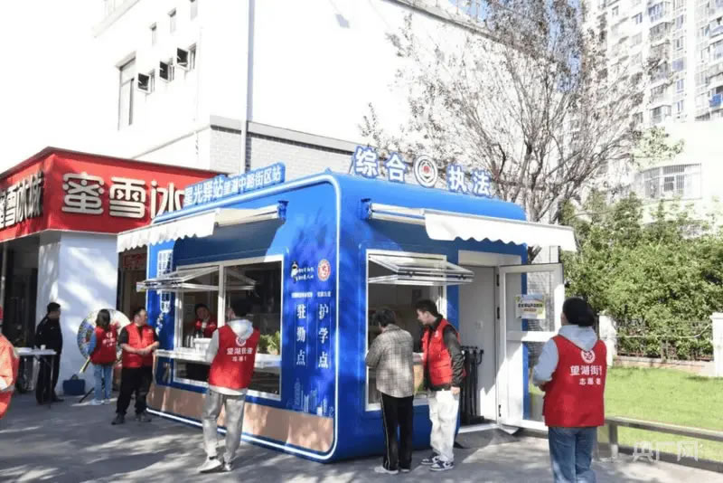 作為街區(qū)重要的“便民樞紐”,星光驛站功能定位清晰明確:面向戶外勞動者,這里是一座“能量補給站”,免費提供飲水、熱飯、充電等基礎(chǔ)服務(wù),驅(qū)散奔忙的疲憊;對于周邊居民,它是一處“暖心港灣”,常態(tài)化開展義診、義剪等志愿服務(wù),讓便利直達身邊;針對沿街商戶,驛站則是一個“助力平臺”,及時更新政策手冊、提供證照辦理咨詢,助力經(jīng)營發(fā)展。