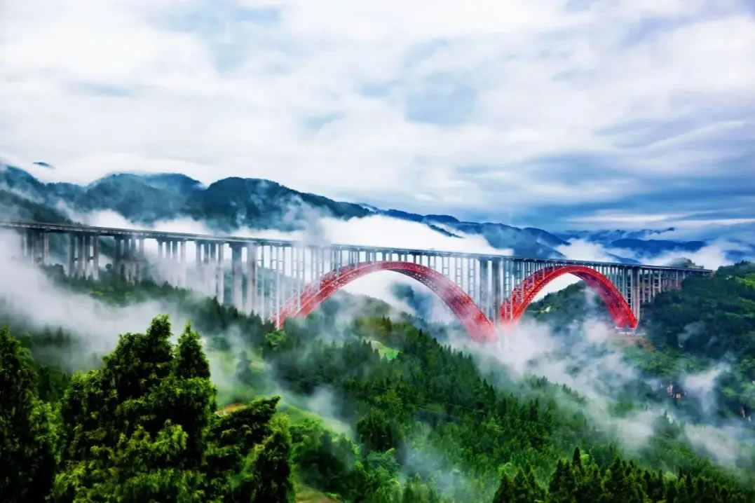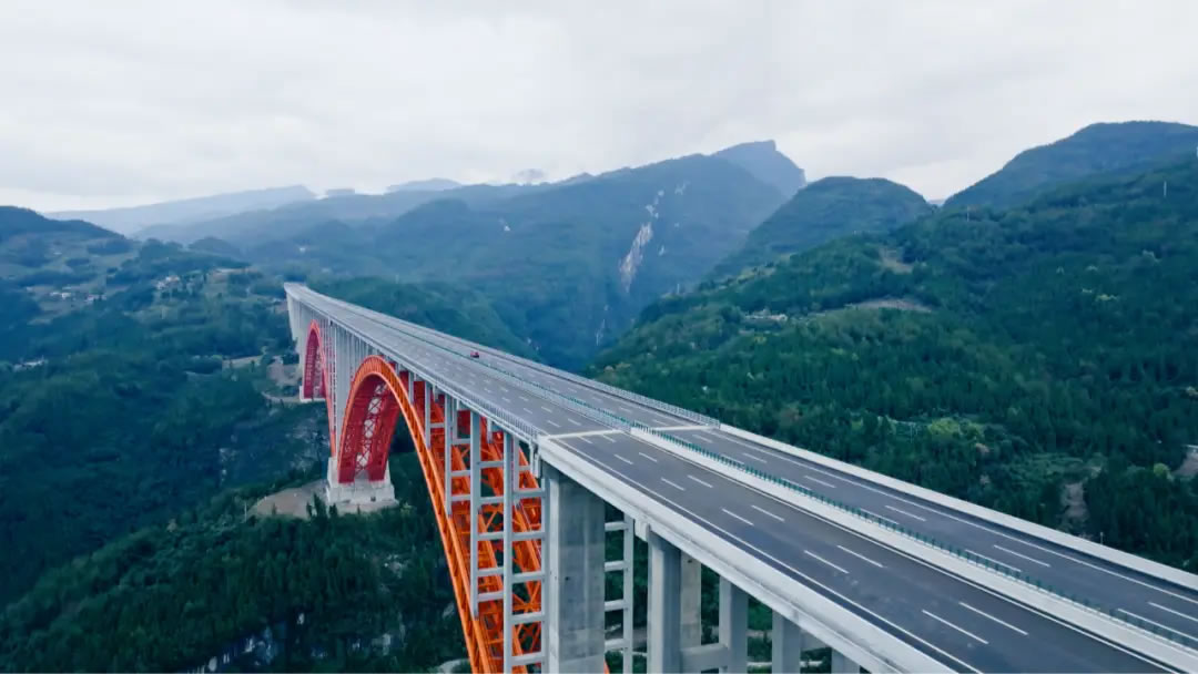 山澗云興霞蔚,雙虹飛跨天險。橙紅拱如晨曦暈染,勾勒群山力量曲線;簡潔的四肢鋼管,書寫出結(jié)構(gòu)美學(xué)的動人詩篇。索道飛越,是工程與自然的和諧共舞;樁基深植,是技術(shù)與地質(zhì)的真誠對話。雙堡特大橋連接山與山,更連接人與自然。