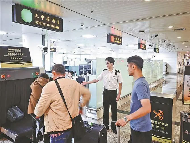 廈門機(jī)場海關(guān)關(guān)員對(duì)進(jìn)境旅客開展監(jiān)管作業(yè)。(通訊員 于挺洋 攝)