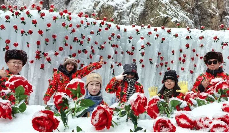 冰封的玫瑰、融入巖畫元素的雪雕、百米長(zhǎng)的雪圈滑道,將景區(qū)打造成夢(mèng)幻的冰雪秘境。身著多彩冬裝的游客們穿梭其間,或駐足觀賞或拍照打卡,不時(shí)發(fā)出陣陣贊嘆。“巖畫和冰雪結(jié)合,就像穿越到了冰河時(shí)代!”來自西安的游客李女士,一邊拍攝冰封玫瑰,一邊向同伴分享自己的感受。