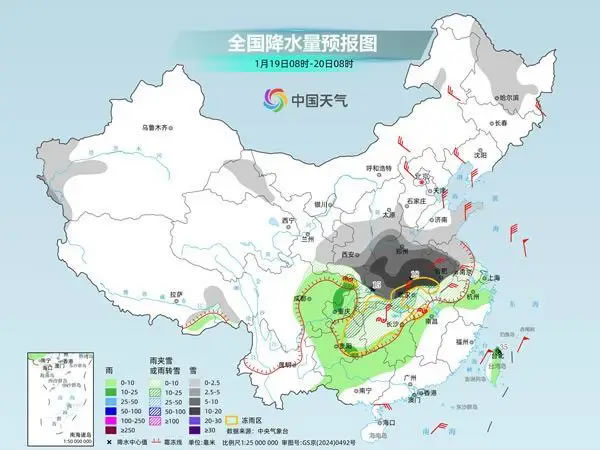 中東部這輪大范圍雨雪過程中,秦嶺至淮河以北地區(qū)以干雪為主,以南地區(qū)降水相態(tài)復雜,有雨雪及凍雨的轉換,局地新增積雪深度可達15厘米以上,湖南、貴州等地或現(xiàn)較大范圍的凍雨,對交通出行、農業(yè)生產、電力通信有不利影響,公眾需提前做好防范措施。