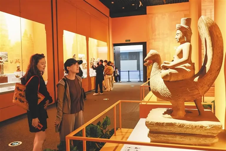 1月22日,觀眾在中國(海南)南海博物館里參觀“水與石的史詩——柬埔寨古代文明特展”。近日,由中國(海南)南海博物館、中國文物交流中心和柬埔寨國家博物館主辦的“水與石的史詩——柬埔寨古代文明特展”在中國(海南)南海博物館開幕。該展展出來自柬埔寨國家博物館的石雕、陶器等122件(套)精美文物。(記者 張麗蕓)