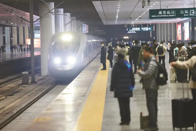 從1月26日零時起,全國鐵路實行新的列車運行圖,調(diào)圖后,圖定旅客列車較原圖增加243列。京滬高鐵標桿列車G25次迎來了“瘦身”升級:這趟京滬間最快高鐵取消原有5個停靠站,僅設(shè)南京南站唯一經(jīng)停點。圖為當日晚,旅客在南京南站準備乘坐G25次列車。(陳儼 攝)