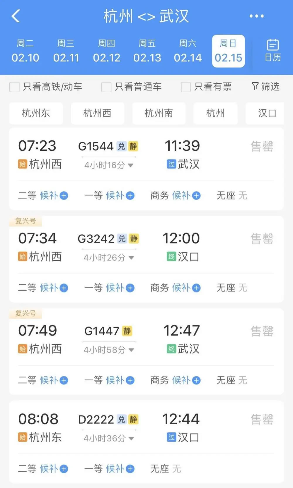 比如,2月15日杭州前往武漢、長沙、南昌、貴陽等地,無論是普速列車還是動(dòng)車組列車,當(dāng)天所有車次已經(jīng)基本全部售罄,只剩極個(gè)別車次硬座、無座席位還有余票。