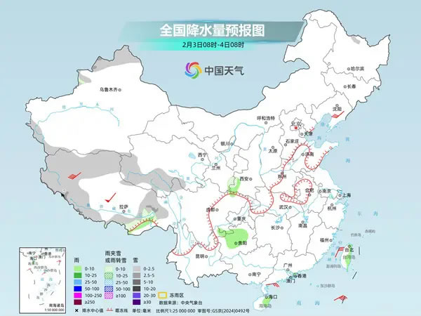 中央氣象臺預(yù)計(jì),今天,新疆北部和西部、西藏西部和東部、青海南部和西部等地部分地區(qū)有小到中雪或雨夾雪,其中,西藏西部局地大雪;貴州西北部和中部、陜西西南部、海南島東部、臺灣島東部等地部分地區(qū)有小雨。