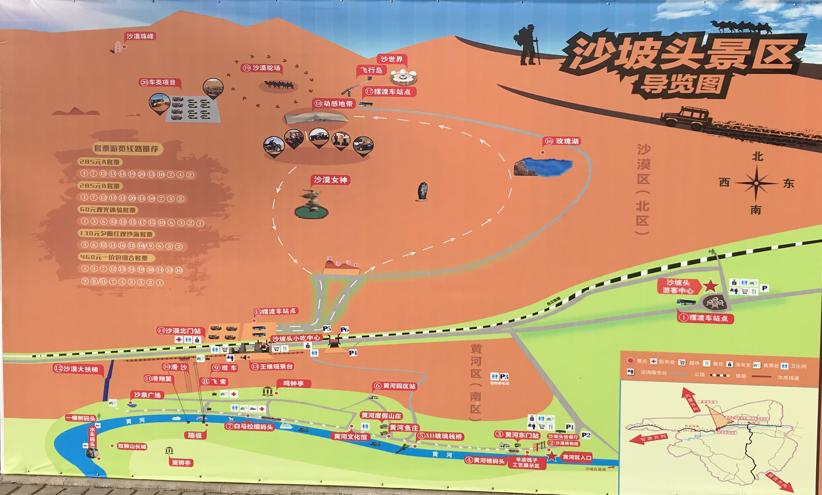 悠悠歲月,由古而今。天賜奇景與人們的不懈創(chuàng)造,使如今的沙坡頭已不是古時(shí)的沙陀頭,它融自然景觀、人文景觀、治沙成果于一體,被世人稱之為“世界沙都”、“世界壟斷性旅游資源”。在這里,“大漠孤煙直,長(zhǎng)河落日?qǐng)A”的古詩(shī)意境得到最完美的體現(xiàn);滑沙聽(tīng)鐘,坡底戲泉,物我兩忘,其樂(lè)無(wú)窮;黃河弄筏,追波逐浪,驚險(xiǎn)刺激;騎駝踏沙,體驗(yàn)沙海輕舟之浩渺,觀大漠日落日出之壯美;觀星賞月,聽(tīng)沙漠夜聲之神秘;圍篝火,飲酒吃肉,狂歌勁舞,大漠探險(xiǎn)神秘引人;古老的河灣水車,輪轉(zhuǎn)水瀉,澆田灌園,別有情趣;沙下果園,疊翠流紅,鳥(niǎo)語(yǔ)花香,瓜甜果艷,令人流連忘返;“一線牽南北”的雙架索道,可實(shí)現(xiàn)凌空跨河比翼雙飛的夢(mèng)想;古老的黃河木帆船、赤背的纖夫,將“妹妹你坐船頭,哥哥我岸上走”的歌曲變?yōu)楝F(xiàn)實(shí)美的享受;空中飛行、高空跳傘走出影視蒙太奇,飄落沙山;沙雕、沙療、沙浴和沙漠球類、沙漠田徑等形式多樣的“沙”字號(hào)體育健身競(jìng)技項(xiàng)目,融智慧、趣味、知識(shí)、健身為一體;民族風(fēng)情演出、黃河梨花節(jié)、大漠黃河國(guó)際旅游節(jié),形式新穎,內(nèi)容獨(dú)特。將在5月4日舉行的大漠舞龍大賽,百余條巨龍?jiān)诤棋尿v格里大漠騰滾翻飛,場(chǎng)面恢宏,氣勢(shì)雄偉,鑼鼓震天,令人心動(dòng)……這,就是今日之全新的沙坡頭旅游區(qū),2000年被國(guó)家評(píng)定為AAAA級(jí)旅游區(qū),它是寧夏人之驕傲,是馳名中外的旅游勝地。