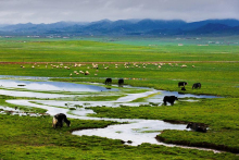 祁連山草原因交融之美,被評(píng)為“中國(guó)最美的六大草原”之一,具有面積大、草質(zhì)好、類(lèi)型多、產(chǎn)草量高等特點(diǎn),有罕見(jiàn)的林中草場(chǎng)。海拔4000以上還有高山積雪形成的碩長(zhǎng)而寬闊的冰川地貌奇麗壯觀。進(jìn)入祁連境內(nèi),放眼望去,滿(mǎn)目盡是草原旖旎的風(fēng)光。夏季的草原像是廣袤無(wú)垠的綠毯,滿(mǎn)山的白藏羊恰似散落的珍珠,黑色的牛毛帳篷、裊裊升起的炊煙、牧人悠揚(yáng)的歌聲,這一幕如畫(huà)風(fēng)景卻是草原最尋常的景色。
