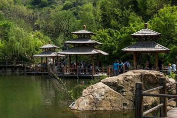 九如山以自然山水而聞名,山依水勢,水奪天工,托起一片世外奧區(qū)。遠(yuǎn)遠(yuǎn)望去,可見泉涌成溪,溪流成瀑,瀑落成潭,潭潭相通,匯集成八潭明鏡。是所謂:峽谷有流,聚在平湖,山泉涓滴,匯成高潭。層層疊嶂,層層儲水,一年四季,不管天公旱澇,無論氣候寒暑,九如山的潭水總是那樣清瑩玉潔,滋潤山體。游人可以在潭中泛舟,可以在池邊戲水,享受天開畫境,觸摸水景幻變,放懷吸取大自然的無窮靈感。
