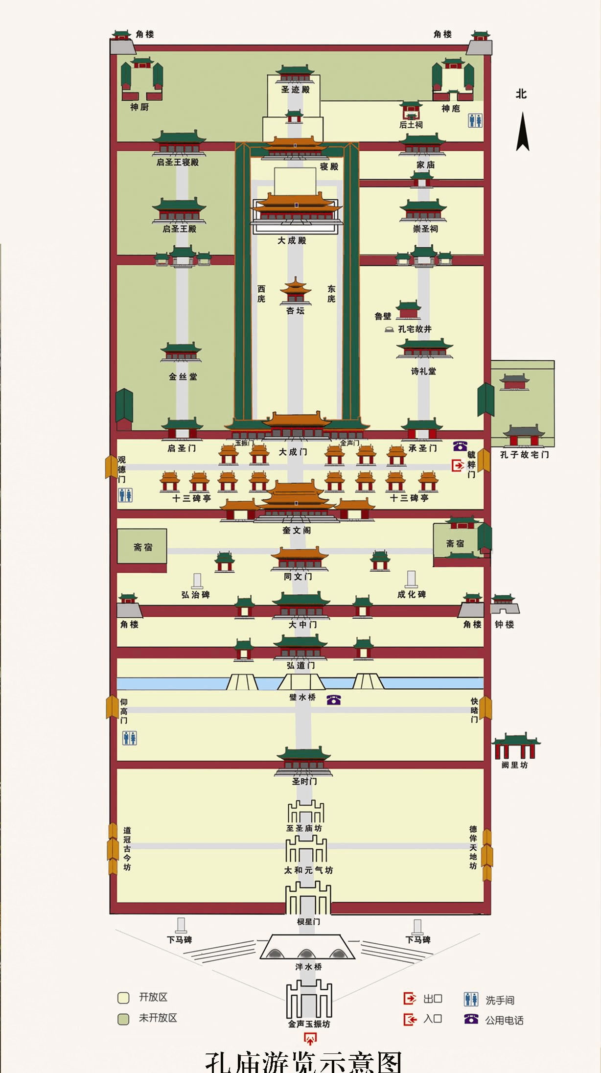 據(jù)《孟子》記載:“孟子曰:‘伯夷,圣之清者也;伊尹,圣之任者也;柳下惠,圣之和者也;孔子,圣之時(shí)者也!币馑际钦f,在圣人之中孔子是最適合時(shí)代的。據(jù)此,清世宗于雍正八年(1730年)欽定孔廟正門名“圣時(shí)門”。圣時(shí)門始建于明永樂十三年(1415年),3間,弘治年間擴(kuò)為5間中設(shè)拱門3 券,碧瓦歇山頂,四周是深紅的墻皮,券內(nèi)是杏黃的墻里,前后石階上各有石刻龍陛。由拱門內(nèi)望,令人有深邃莫測之感。