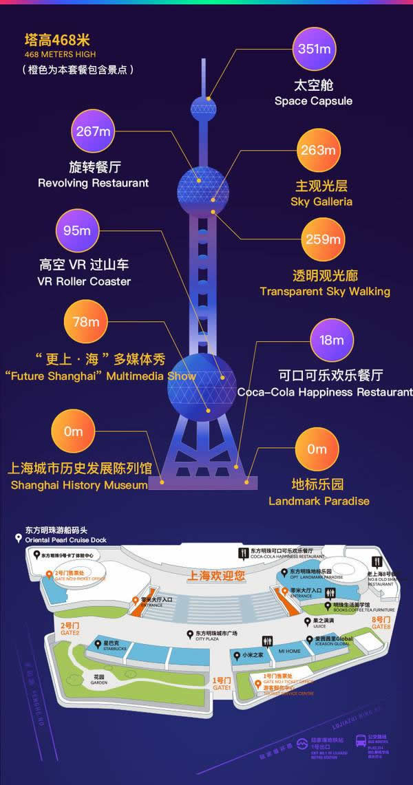 東方明珠廣播電視塔內(nèi)共有5個觀光層,主要由高90米、直徑50米的下球體室外觀光廊和高272.5米、直徑45米的上球體觀光層組成,是鳥瞰上海全市的最佳場所之一。
