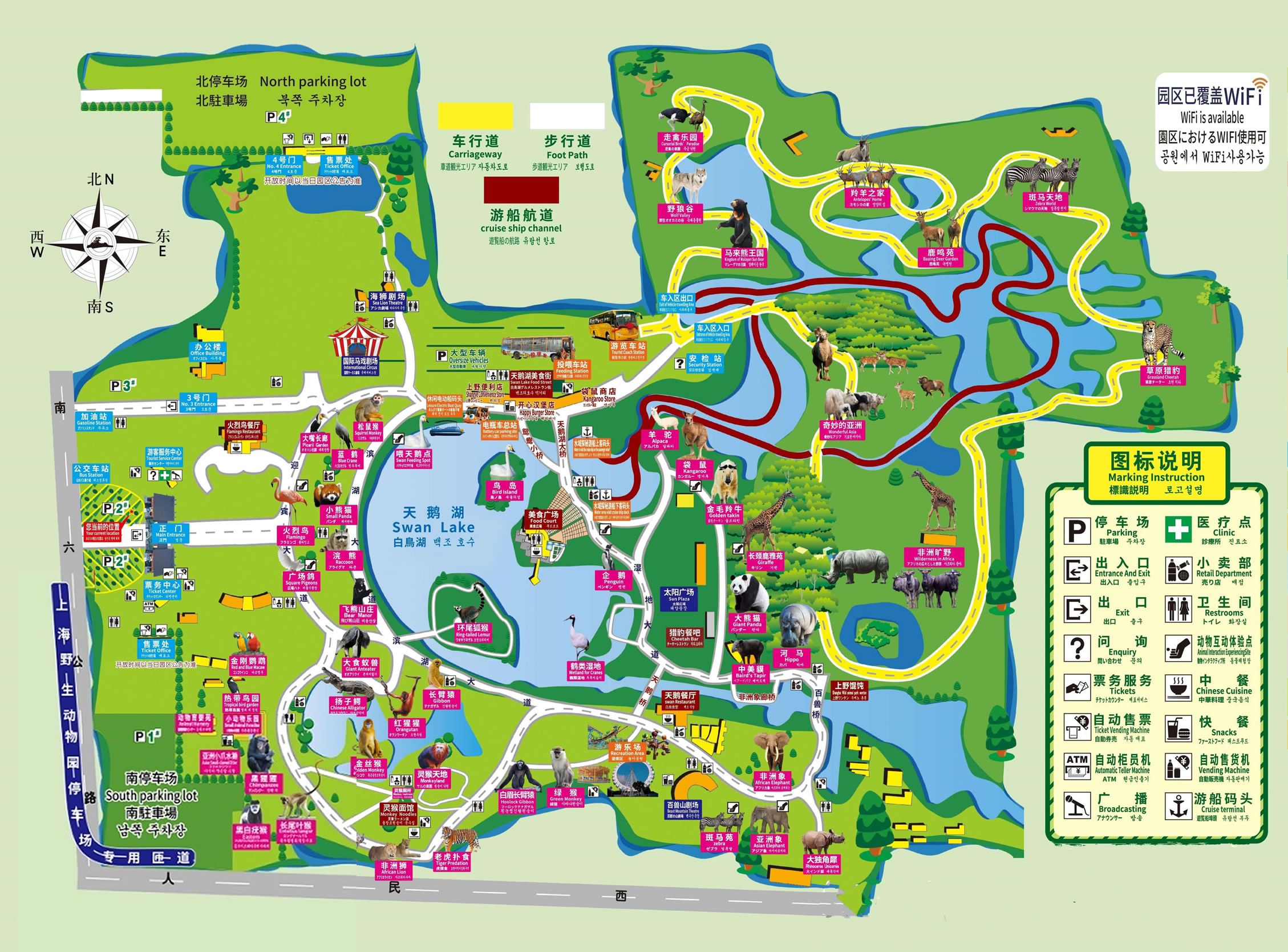 上海野生動(dòng)物園現(xiàn)有車入?yún)^(qū)、步行區(qū)兩大區(qū)域。車入?yún)^(qū)分布著奇妙的亞洲、非洲曠野、優(yōu)雅長(zhǎng)頸鹿、最美閃電俠、草原霸主、荒野大力熊、森林之王、白虎領(lǐng)地、野狼谷、馬來(lái)熊王國(guó)10大主題區(qū)域。步行區(qū)則分布著大熊貓館、鶴類濕地、火烈鳥展區(qū)、企鵝館、天鵝湖、羊駝苑、紅猩猩館、中美貘館、小動(dòng)物樂(lè)園、鸚鵡館、河馬館、白眉長(zhǎng)臂猿展區(qū)、大食蟻獸展區(qū)、鱷魚島、狐猴島、浣熊展區(qū)、金絲猴島、飛熊山莊、綠猴區(qū)、白虎展區(qū)、松鼠猴、小熊貓區(qū)、黑猩猩館、袋鼠坡、長(zhǎng)頸鹿雅苑、亞洲象展區(qū)、金毛羚牛館、國(guó)禮非洲獅展區(qū)、熱帶鳥園、斑馬苑、非洲象展區(qū)、老虎撲食區(qū)、白頰長(zhǎng)臂猿島、藍(lán)鶴、大獨(dú)角犀、大嘴長(zhǎng)廊、靈猴天地、亞洲小爪水獺展區(qū)、太陽(yáng)廣場(chǎng)共39個(gè)館區(qū)。