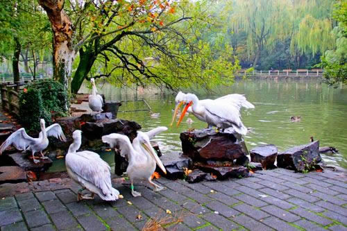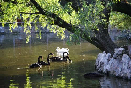 上海動(dòng)物園天鵝湖建于1954年,面積近3.3公頃(近50畝),是由幾個(gè)天然水塘開(kāi)挖連成的,因首先飼養(yǎng)天鵝而得名,一座三孔橋南北橫跨。湖東一座琉璃綠瓦的四角亭,與西面鴛鴦榭遙遙相對(duì),臨水倚欄,觀賞水禽、飛鳥(niǎo),尤其每天鵜鶘在上空盤(pán)旋,令人迷離神往。