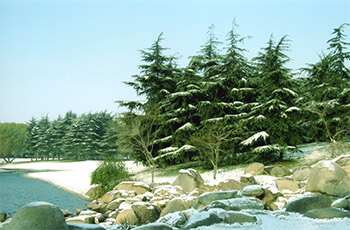 公園溫室面積887平方米,培育各種花卉、熱帶植物和盆景,供公園自用。嫩江路以南18萬平方米苗圃培育銀杏、棕櫚、廣玉蘭、羅漢松、水杉、雪松、海棠、瓜子黃楊、胡頹子、龍柏、翠柏等48種,為公園的綠化配置、調(diào)整、移植提供苗木,并對外出售綠化用苗。