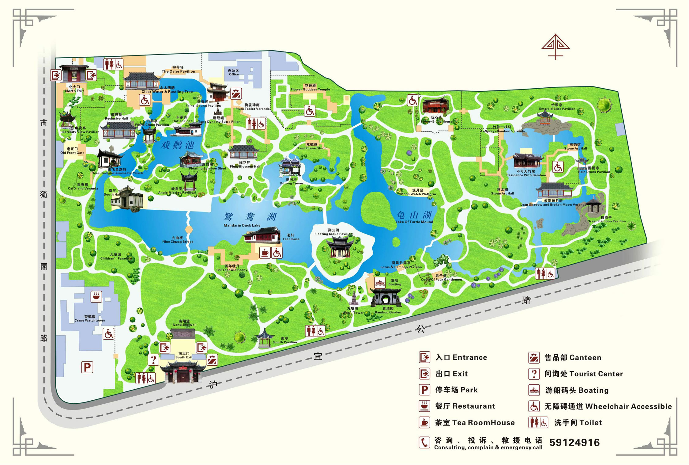 龜山位于青清園與鴛鴦湖之間,高7米,面積5畝,四面環(huán)水,四周有小橋相通,如巨龜四爪。龜山之東有圓形小島,是巨龜之首,名"龜頭島"。