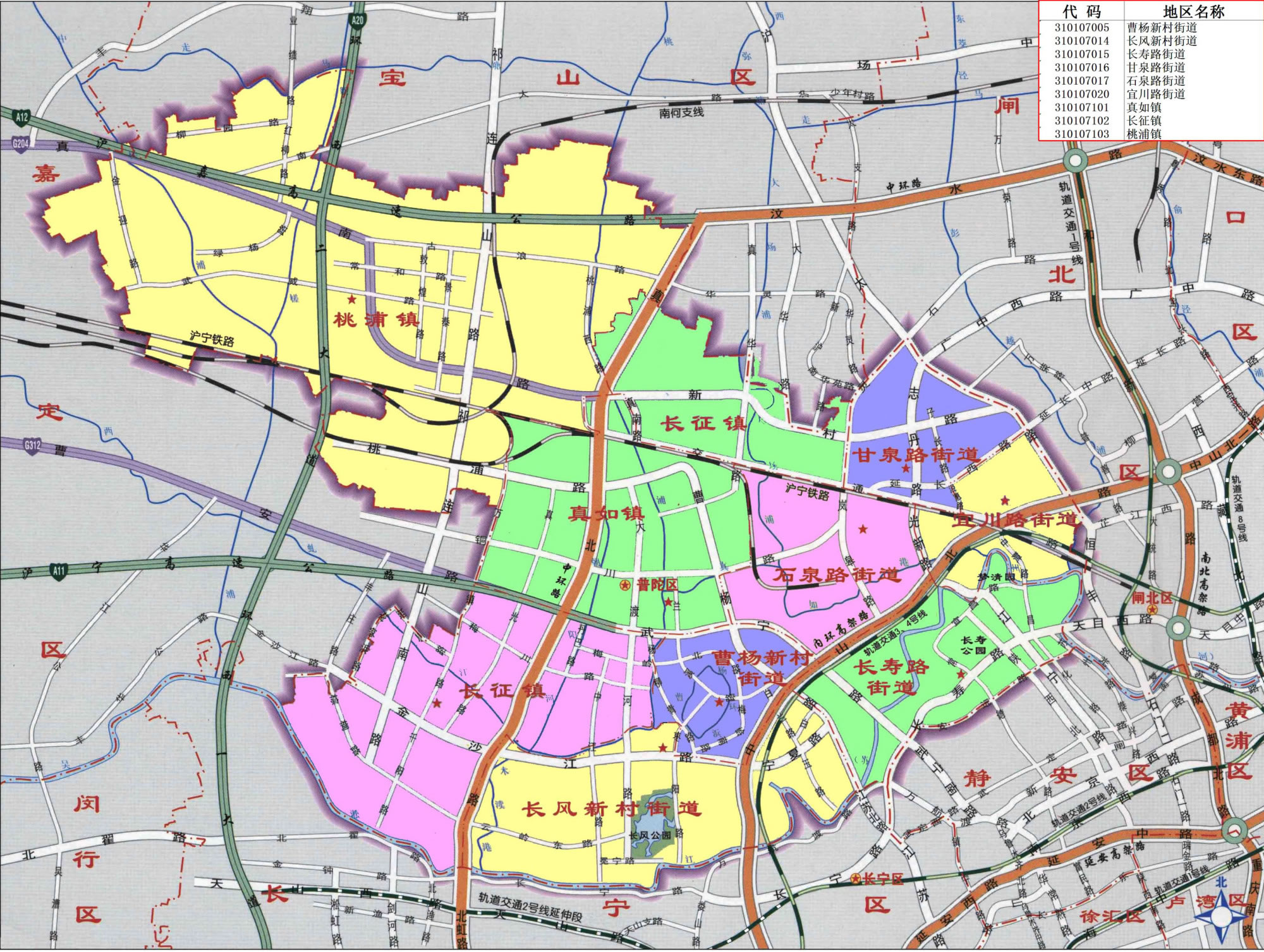 街道:曹楊新村街道、長風(fēng)新村街道、長壽路街道、甘泉路街道、石泉路街道、宜川路街道、萬里街道、真如鎮(zhèn)街道