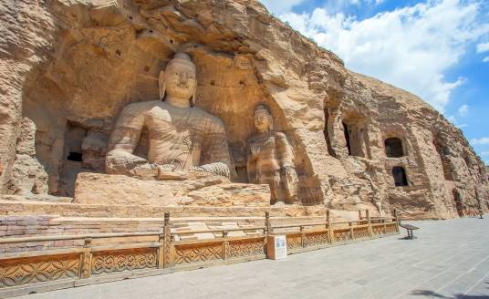 云岡石窟,原名靈巖寺、石佛寺。位于山西省大同市西郊17公里處的武州山南麓,是中國著名的石窟群之一。云岡石窟的開鑿始于北魏時期,北魏皇始三年(398年),道武帝拓跋珪將都城從盛樂(今和林格爾縣)遷至平城(今大同市),武州山成為盛樂與平城之間的交通要沖。文成帝拓跋濬即位后,令沙門統(tǒng)曇曜主持復法大業(yè)。在文成帝的支持下,曇曜選擇了鐘靈毓秀的武州山,"鑿山石壁,開窟五所,鐫建佛像各一,高者七十尺,次六十尺,雕飾奇?zhèn)ィ谟谝皇?quot;。云岡的大部分洞窟在孝文帝元宏遷都洛陽前完工,但是造像工程則一直延續(xù)到正光年間(520~525年)。云岡石窟的開鑿歷時約150年,歷經(jīng)北魏、東魏、西魏、北齊、隋、唐等朝代,現(xiàn)存主要洞窟45個,大小窟龕252個,石雕造像59000余尊,是中國石窟藝術寶庫中的瑰寶。