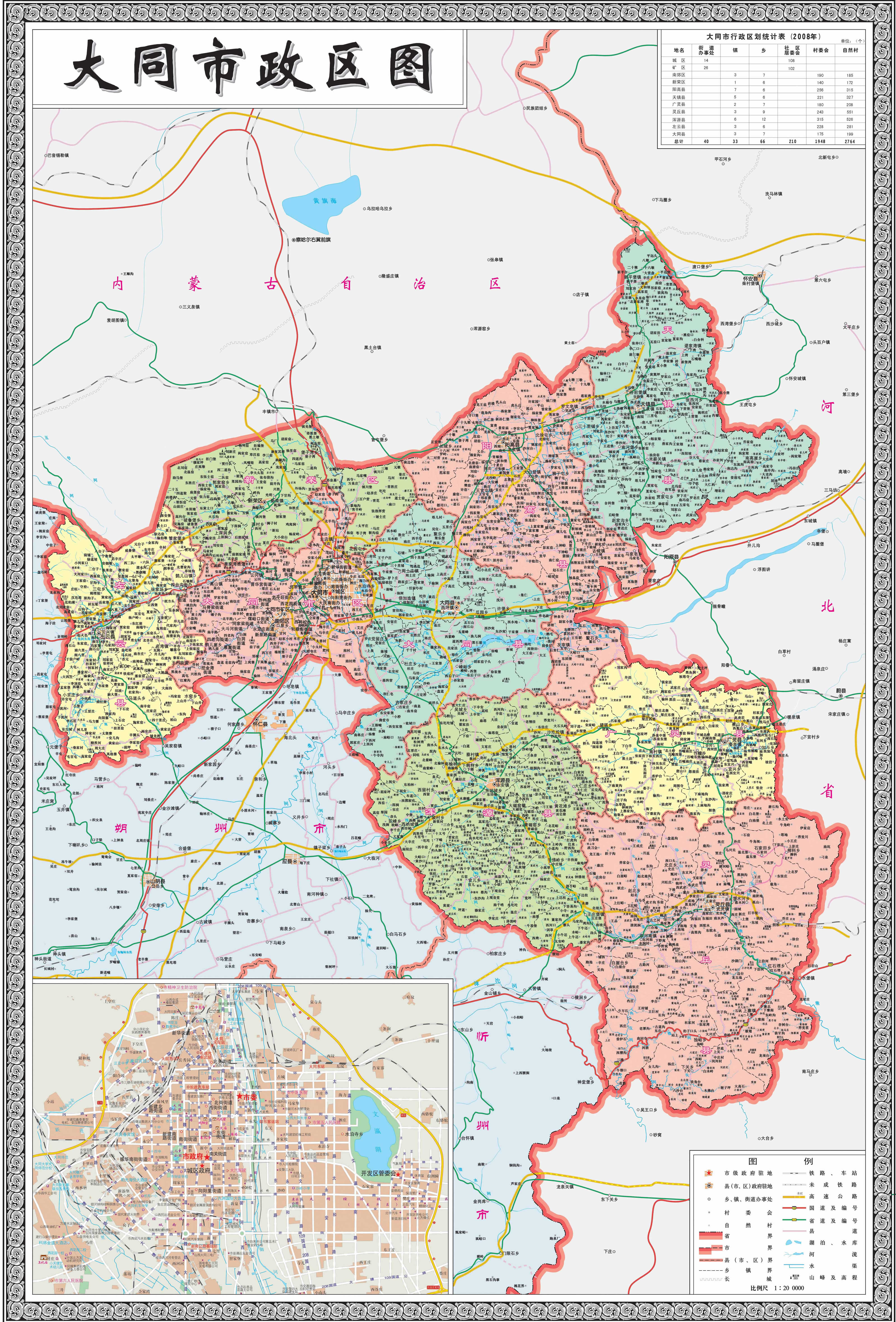 大同市位于山西省最北端,北以外長城為界,與內(nèi)蒙古自治區(qū)烏蘭察布市的興和縣、豐鎮(zhèn)市、涼城縣毗鄰,西、南與本省朔州市的右玉縣、懷仁市、應縣及忻州市的繁峙縣相連,東與河北省張家口市的懷安縣、陽原縣、蔚縣及保定市的淶源縣、阜平縣接,公路里程距北京約330千米、太原約290千米、呼和浩特約300千米。大同市總面積14176平方千米,市區(qū)面積2080平方千米,建成區(qū)面積149.68平方千米。