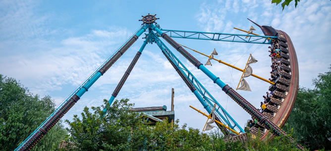 隨著美人魚(yú)大炮怒吼,沉睡的海底遺跡、兇猛的海洋生物讓開(kāi)了航,15米高18海里/小時(shí)航速,60度擺角,海盜船繞水平軸由緩至急、往復(fù)擺動(dòng),時(shí)而沖上駭浪、時(shí)而跌入驚濤,帶您體驗(yàn)無(wú)拘無(wú)束而精彩刺激的冒險(xiǎn)旅行,讓您領(lǐng)略絢麗迷人而傳奇神秘的海盜生活:骷髏、獨(dú)眼、木腿、鐵鉤、鸚鵡、金銀島、藏寶圖……圣·克斯基號(hào)船長(zhǎng)來(lái)了!