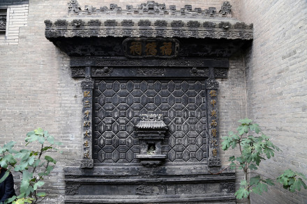 喬家大院大門坐西向東,為拱形門洞,上有高大的頂樓,頂樓正中懸掛著山西巡撫受慈禧太后面喻而贈送的匾額,上書“福種瑯環(huán)”四個大字。黑漆大門扇上裝有一對椒圖獸街大銅環(huán),并鑲嵌著銅底板對聯(lián)一付:“子孫賢,族將大;兄弟睦,家之肥!弊掷镄虚g透露著喬在中堂主人的希望和追求,也許正是遵循這樣的治家之道,喬在中堂經(jīng)過連續(xù)幾代人的努力,達到了后來人丁興旺、家資萬貫的輝煌。大門頂端正中嵌青石一塊,上書“古風(fēng)”。大門對面的掩壁上,刻有磚雕“百壽圖”,一字一個樣,字字有風(fēng)采。百壽圖為“在中堂”主人喬致庸的孫婿、近代著名學(xué)者、篆書家常贊春書寫。掩壁兩旁是清朝大臣左宗棠題贈的一付意味深長的篆體楹聯(lián):“損人欲以復(fù)天理,蓄道德而能文章!遍侯~是“履和”。甬道的西盡頭處是雕龍畫棟的喬氏祠堂,與大門遙相對應(yīng)。祠堂裝點得十分講究,三級臺階,廟宇結(jié)構(gòu),以獅子頭柱,漢白玉石雕,壽字扶欄,通天欞門木雕夾扇。出檐以四條柱子承頂,柱頭有玉樹交榮、蘭馨桂馥、藤羅繞松的鏤空木雕。額頭有匾,上書“仁周義溥”四字,李鴻章所題。祠堂里原陳列著木刻精雕的三層祖先牌位。